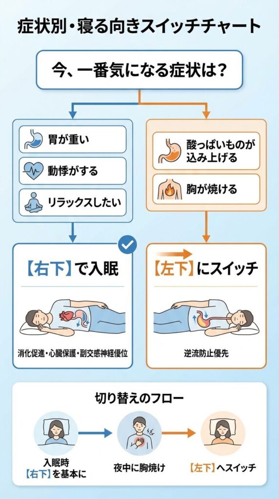 結論からお伝えします。心臓への負担を減らし、消化を助けたいなら「右下」が基本です。しかし、胸焼け(逆流感)がある時だけは「左下」が正解になります。