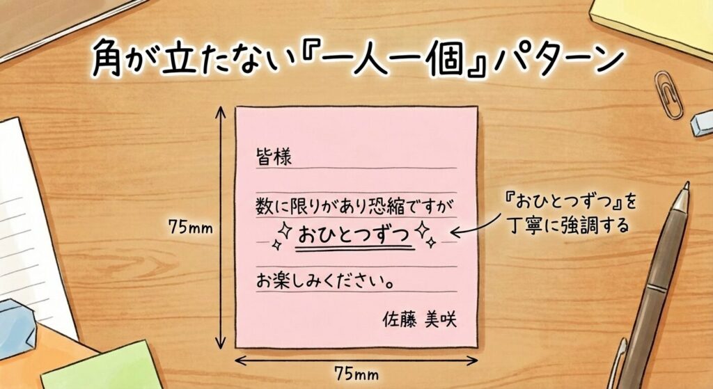 これが一番の悩みどころですよね。「一人一個でお願いします」と書くと、どうしてもケチな印象や、命令口調の角が立ってしまいます。