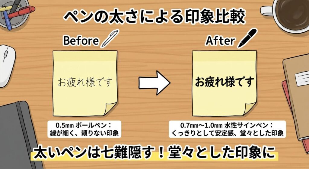 デスクにある0.5mmのボールペンで書いていませんか? 細いペンは、手の震えや線の歪みがダイレクトに出てしまうため、字のアラが目立ちやすいのです。