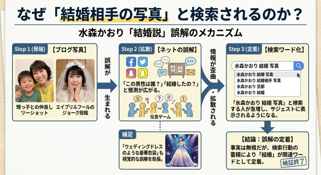 また、水森かおりさんはサービス精神が旺盛で、過去のエイプリルフール(4月1日)にブログで「結婚しました!」というジョーク記事を投稿したことがあります(もちろん、すぐにネタばらしされています)。この時のインパクトが強すぎて、ネット上に「結婚」というキーワードだけが亡霊のように残ってしまったのです。
