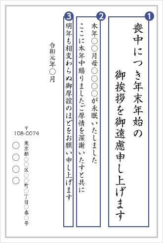 1. 「喪中につき新年のご挨拶を失礼させていただきます」という挨拶文を最初に。