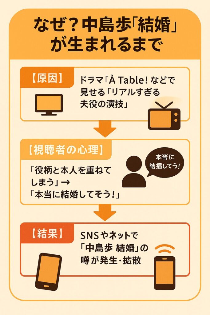 中島歩さんに「結婚している」という噂が流れるのには、主に3つの理由があります。