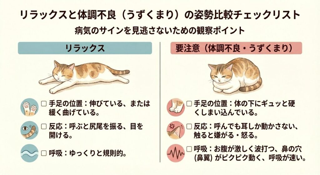 特に「呼吸が荒い」「お腹をかばうように丸まっている」場合は、腹痛や呼吸器疾患の疑いがあります。すぐに動物病院へ相談してください。