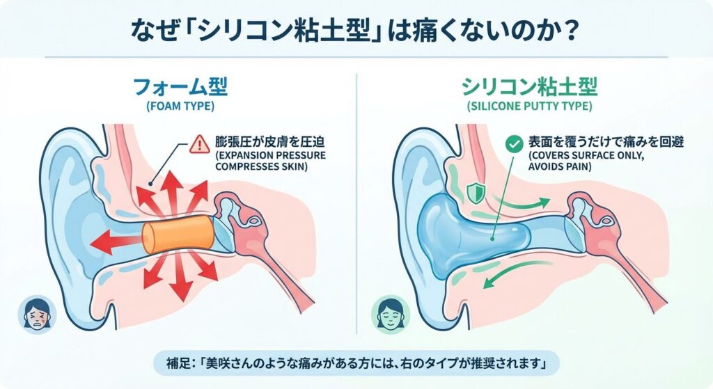 1. 外耳道への過剰な圧迫: 美咲さんがお使いの「フォームタイプ(スポンジ状)」は、耳の中で膨らむ力が強く、長時間使い続けると皮膚を圧迫し、血流を阻害して痛みを生じさせます。
