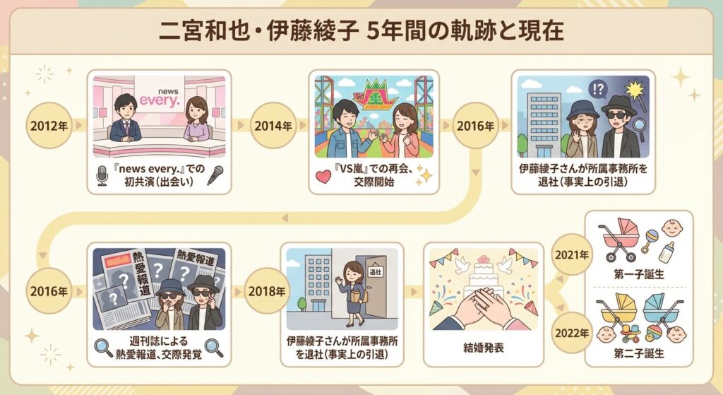 二宮和也さんと伊藤綾子さんの出会いは、2012年8月のことでした。 当時、二宮和也さんが『24時間テレビ』の宣伝のために、伊藤綾子さんがキャスターを務めていた『news every.』に生出演したことがきっかけです。その後、2014年に嵐の冠番組『VS嵐』に伊藤綾子さんが「美人キャスターチーム」の一員としてゲスト出演したことで再会し、連絡先を交換して交際に発展したと言われています。