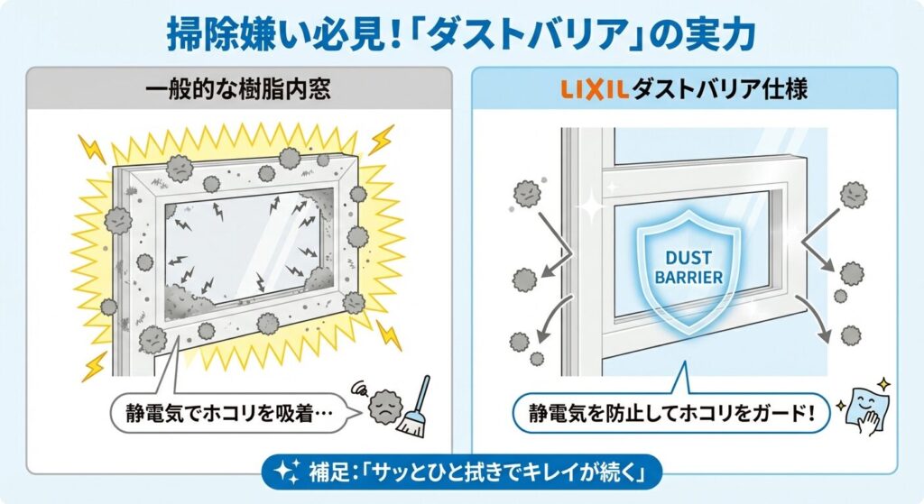 しかし、LIXILのインプラス(ダストバリア仕様)は、樹脂そのものに帯電防止素材が練り込まれています。 これにより静電気の発生を抑え、ホコリを寄せ付けません。汚れてもサッと拭くだけで綺麗になります。