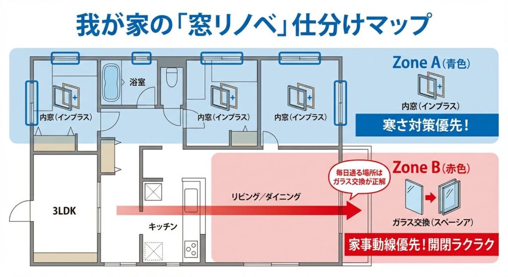 次に、「開閉のストレス」をどう解決するかです。ここで重要なのが、「全ての窓に内窓をつける必要はない」という発想の転換です。