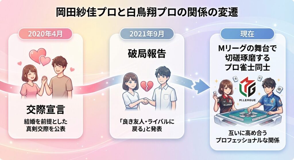 しかし、その関係は約1年半で終止符を打ちます。2021年9月、岡田紗佳プロは自身の公式X(旧Twitter)にて、白鳥翔プロと破局したことを報告しました。
