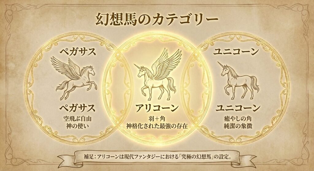 「アリコーン」という言葉は、もともとラテン語でユニコーンの角の「材質」そのものを指す言葉でした。しかし、現代ではペガサスの機動力とユニコーンの魔力を兼ね備えた、より強力で神聖なハイブリッド種を指す言葉として定着しています。