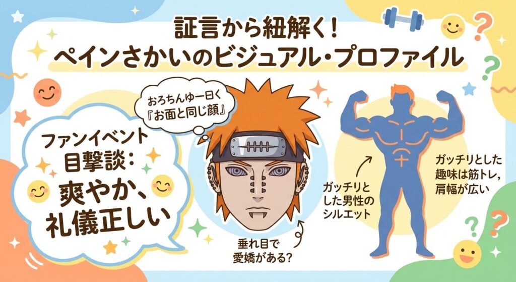 あのお面は、少し垂れ目で愛嬌のある顔立ちをしていますよね。つまり、ペインさかいの素顔も、キリッとしたクール系というよりは、親しみやすい「愛され系」のルックスである可能性が高いと言えます。