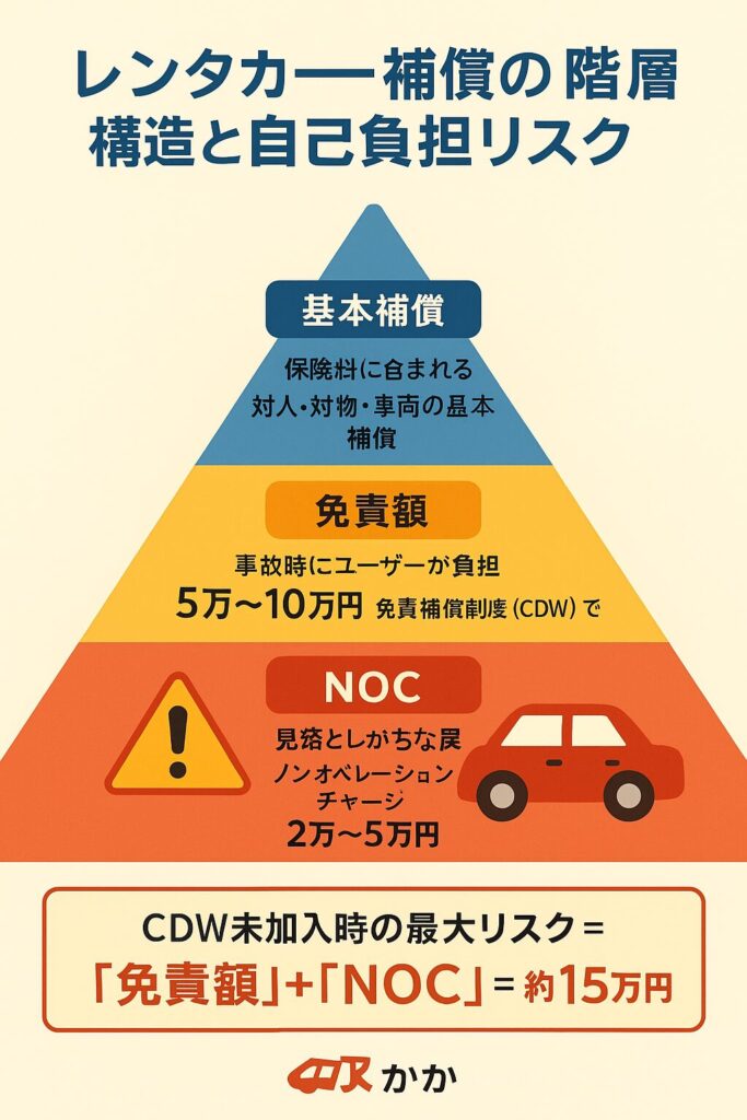 レンタカーの補償制度は、実は3階層のピラミッド構造になっています。ここを理解しないと、リスクの総額計算(最大損失額)を見誤ります。