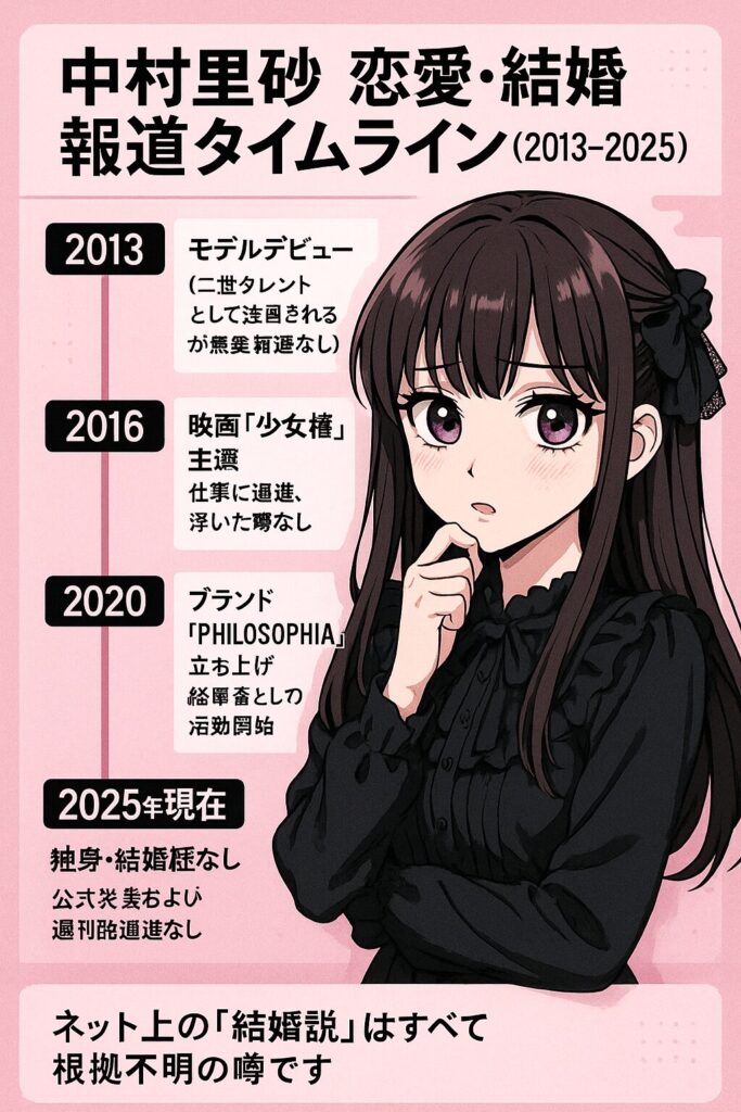 ネット上では時折、「一般男性と結婚したのでは?」「実は隠し子がいる?」といった噂が飛び交うことがありますが、これらはすべて根拠のないデマです。大手メディアであるORICON NEWSや、彼女がレギュラーモデルを務める雑誌『PECHE』などの公式情報を徹底的に調査しましたが、中村里砂の結婚を裏付ける事実は一切存在しません。
