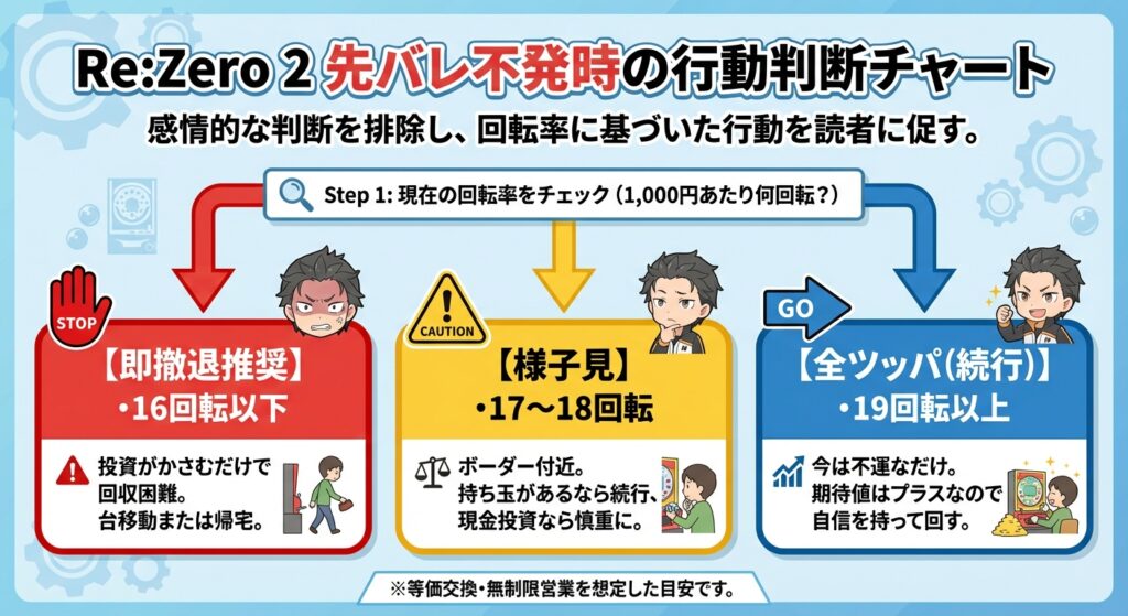 もし、あなたが打っているリゼロ2が、1,000円あたり17回転未満しか回っていないのであれば、先バレが来ようが来まいが、その台は「打てば打つほど負ける可能性が高い危険な台」です。逆に、1,000円あたり19回転、20回転と回る台であれば、例え1000回転先バレが来なくても、期待値という観点では「打ち続けることが正解」となります。