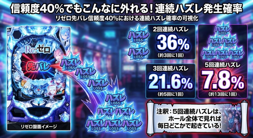 ご覧の通り、5回連続で先バレを外す確率は約7.8%もあります。これは、先バレが13回来れば1回は起こる現象です。ホールには何十台もリゼロがありますから、「5回連続ハズレ」は毎日どこかの台で必ず起きている普通の出来事なのです。