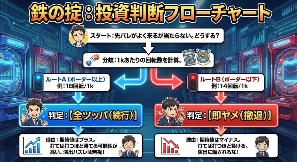 - 判断基準は「回転率」のみ: 演出に惑わされず、1,000円あたりの回転数を計算してください。ボーダー(等価約16.7回)を超えていれば、自信を持って続行しましょう。