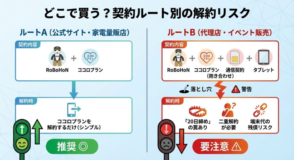 ロボホンの販売チャネルには、シャープ公式サイトなどの「直販」と、ショッピングモールなどのイベントで見かける「代理店(ベネフィットジャパン / ONLY SERVICEなど)」の2種類があります。これらは競合関係にありますが、契約条件、特に「解約のしやすさ」に天と地ほどの差があります。