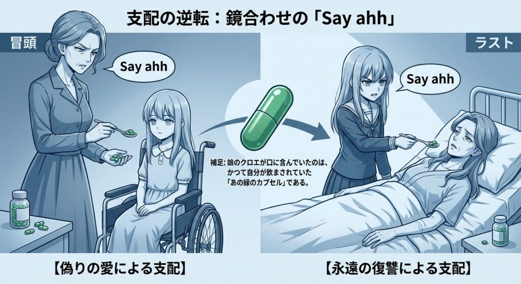 この「Say ahh(あーんして)」というセリフは、映画冒頭で母親のダイアンが、まだ幼い娘のクロエに薬を飲ませる際に使った言葉と全く同じです。かつて母親のダイアンが「愛」という名目で娘のクロエを薬で支配していた構図が、ラストシーンでは完全に逆転しています。娘のクロエは、母親のダイアンを殺すのではなく、自分と同じように「薬で自由を奪い、自分の管理下に置く」という、最も残酷な復讐を選んだのです。