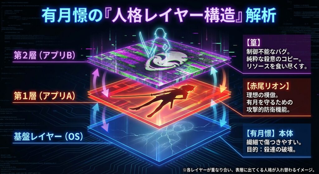 これをPCに例えるなら、「有月憬」というOS(基盤)の上で、「赤尾リオン」や「篁」という強力なアプリケーションが起動している状態です。アプリ(人格)はOS(有月)のリソースを使って動いていますが、時にOSの制御を奪い、暴走を引き起こします。これが、現在のスラー一派の予測不能な行動の原因です。