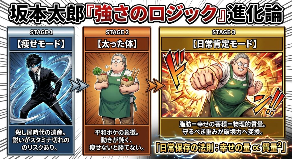 坂本は、殺し屋としての鋭利な技術ではなく、家族と過ごした平和な時間、美味しい食事、その全てを「脂肪(質量)」として蓄積してきました。これまでは「重り」でしかなかったその質量を、守るべきものの重みとして肯定し、打撃の破壊力へと変換したのです。