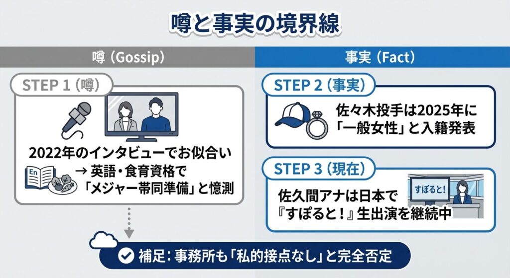 さらに、佐久間みなみアナウンサーが持つ「ハイスペックな属性」が、ファンの妄想を加速させました。佐久間みなみアナウンサーは上智大学出身でTOEIC945点という抜群の英語力を持ち、さらに「食育栄養コンサルタント」の資格まで保有しています。メジャーリーグ挑戦を公言していた佐々木朗希投手にとって、これほど心強いパートナーはいない——。こうした「アスリートの妻としての完璧なスペック」が、事実を追い越して「結婚秒読み」という根拠のない噂へと膨れ上がっていったのです。