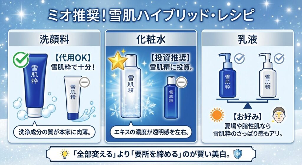 「節約はしたい、でも肌荒れは怖い」。そんな結衣さんの葛藤を解消する、私のおすすめは「洗い流すものは雪肌粋、肌に留めるものは雪肌精」というハイブリッド戦略です。