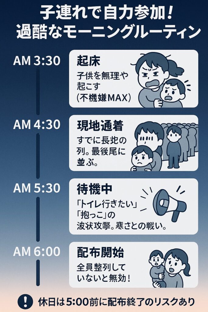 ここでは、なぜ小さな子供連れでの「自力参加(整理券獲得)」がこれほどまでに危険なのか、その理由を私の失敗談と共にお話しします。