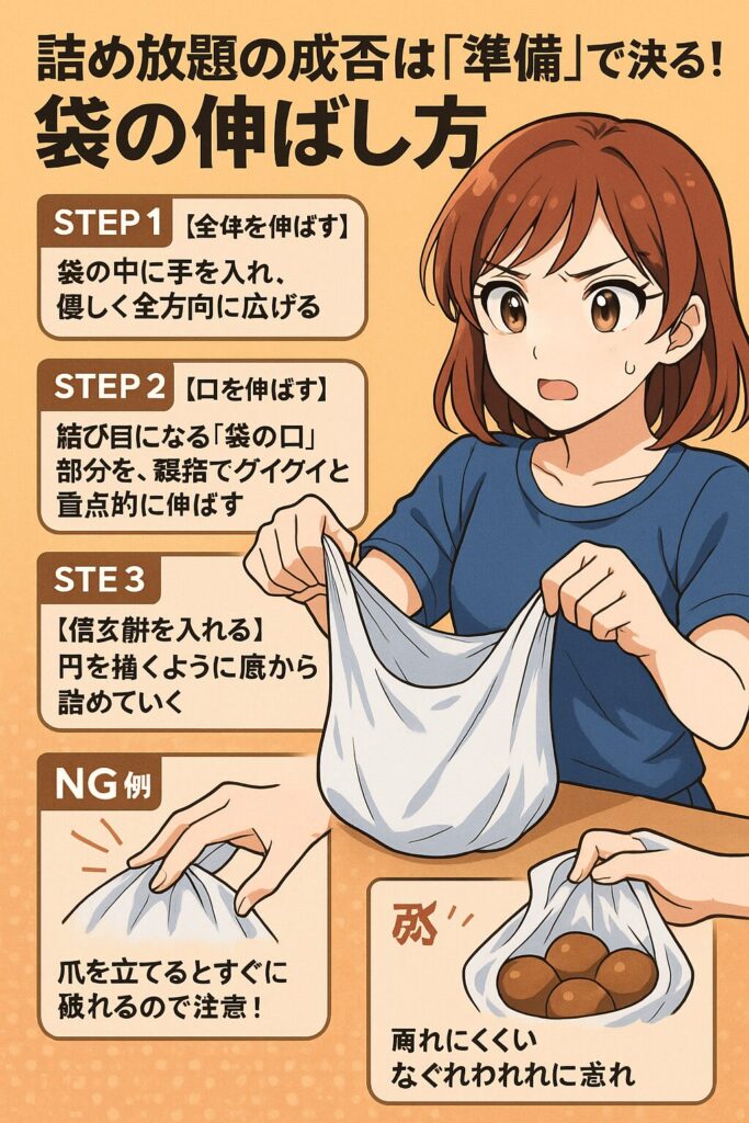 袋をもらったら、すぐに詰め始めず、まずはビニール袋全体を縦横に引っ張って伸ばします。特に「結び目」になる上の部分は、念入りに伸ばしておきましょう。