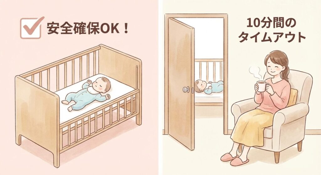 では、具体的にどうやって離れればいいのでしょうか? 厚生労働省も推奨している、事故を防ぐための「タイムアウト(親の休息)」の手順をご紹介します。