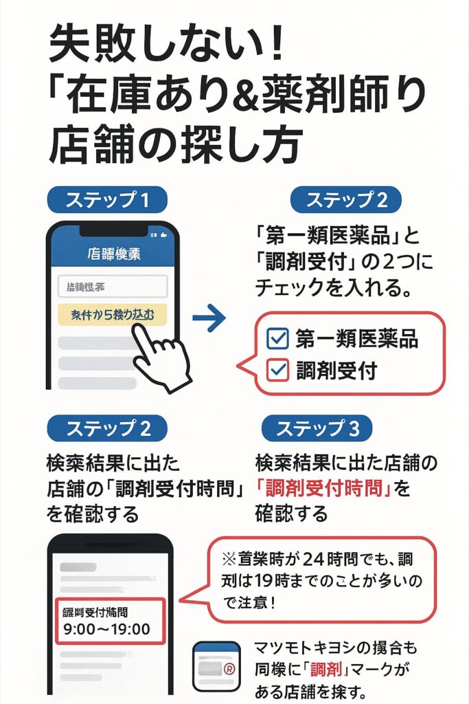 ただし、多くのドラッグストアでは、土日や夜間(19時以降など)は薬剤師が不在になることがあります。薬剤師がいないと、法律上販売できません。必ず行く前に、H2-2で紹介した方法で「調剤受付時間」を確認してください。