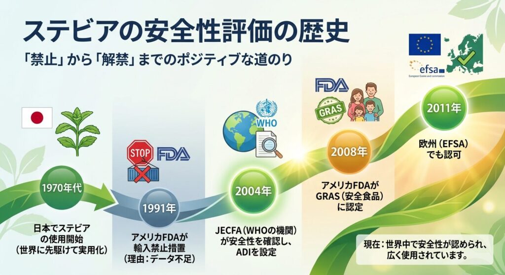 確かに、1991年にアメリカのFDA(食品医薬品局)は、ステビアの輸入を禁止しました。しかし、その理由は「毒性が見つかったから」ではありません。