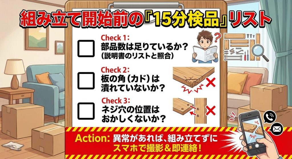 組み立ててしまった後では、返品・交換のハードルが一気に上がります(解体して梱包し直す必要があるため)。「部品が足りない」「板にヒビがある」といった致命的な欠陥は、最初の15分で見つけ出し、その場で写真を撮ってショップに連絡しましょう。