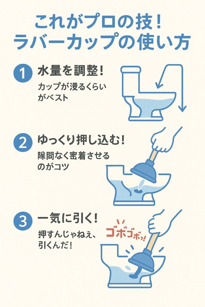 「うわ、トイレ詰まった…!」朝から最悪だよな。水が少しずつしか流れなくて、焦りと不安でいっぱいだと思う。でも落ち着け。今あんたがやるべきことは、たった一つ。「ラバーカップ」を正しく使うことだけだ。