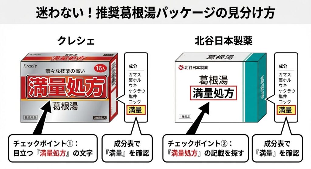 今すぐドラッグストアへ行き、パッケージの裏側か、正面の「満量処方」の文字を探してください。
