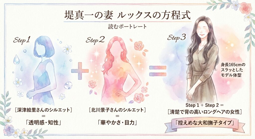 つまり、「深津絵里さんの清楚さ」と「北川景子さんの美貌」を足して2で割ったような、高身長の美人。これが、堤真一さんが選んだパートナーの「正体」です。文字だけでも、その美しさが想像できるのではないでしょうか。