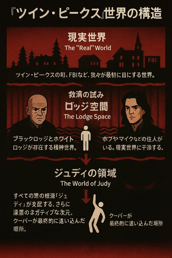 そこへ現れるのが、純粋な正義の化身であるデイル・クーパー捜査官です。彼の目的は、事件を解決し、ローラ・パーマーを守護し救済することでした。しかし、彼の正義感あふれる行動は、結果的に最良の結果を生みません。クーパーは過去に介入してローラの死を防ごうとしますが、それはトラウマを消し去るのではなく、ジュディという、ボブさえも内包するさらに根源的な悪が支配する、別の悪夢の世界線へとローラを引きずり込む結果に終わります。