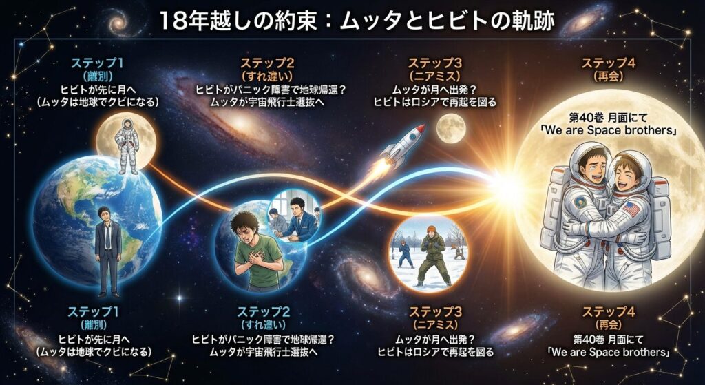 かつてヒビトが先に月へ行き、ムッタがそれを追いかける形ですれ違い続けてきた二人。しかし、数々のトラブルと遠回りを経て、2029年7月16日、ついにムッタのいる月面基地にヒビトが到着します。