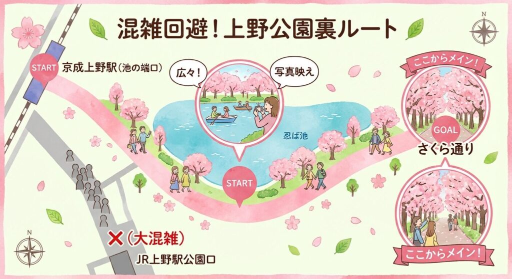 ここは動物園や博物館への動線も重なるため、改札を出た瞬間から人混みの渦に飲み込まれます。ここを避けることが、快適なお花見の第一歩です。