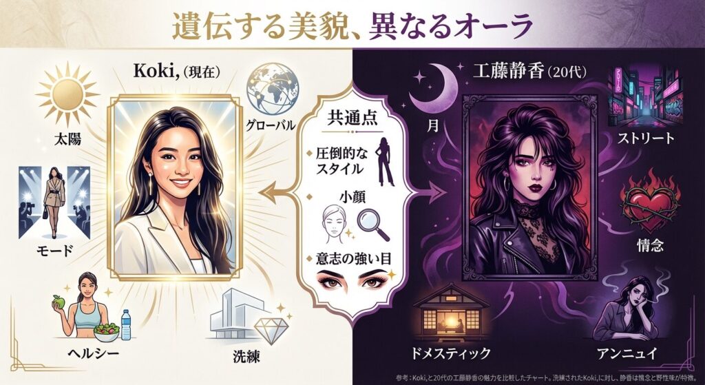 まず、私たちがよく知るKoki,ちゃんと比較してみよう。Koki,ちゃんもスタイル抜群で、ハイブランドが似合う洗練されたモデルだよね。でも、全盛期の静香ママには、そこに決定的な「スパイス」が加わっていたの。