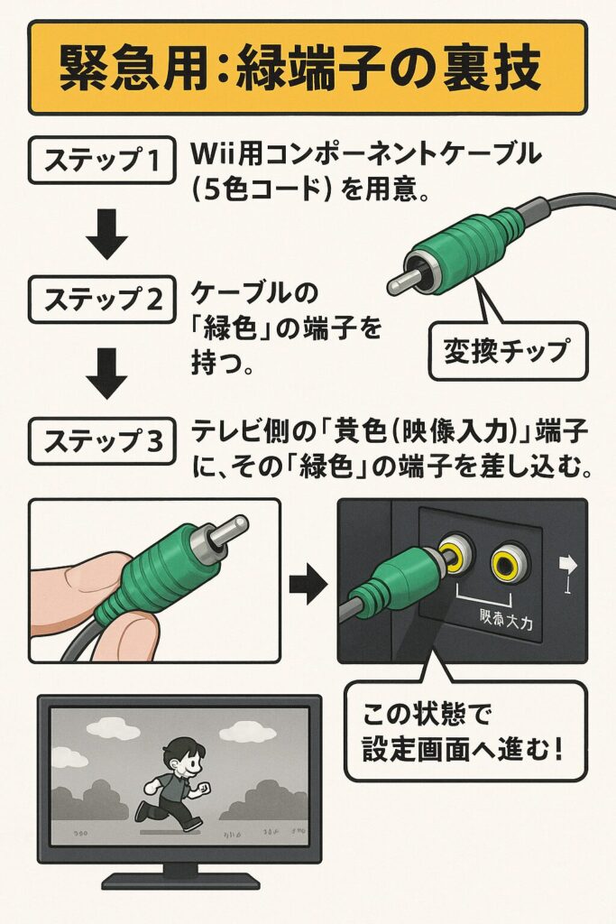 もし、あなたの手元にWii用の「D端子ケーブル」「コンポーネントケーブル(端子が5本あるやつ)」があり、かつテレビに(または変換ケーブル経由で)「黄色いビデオ入力端子」がある場合、この方法で強制的に画面を映すことができます。
