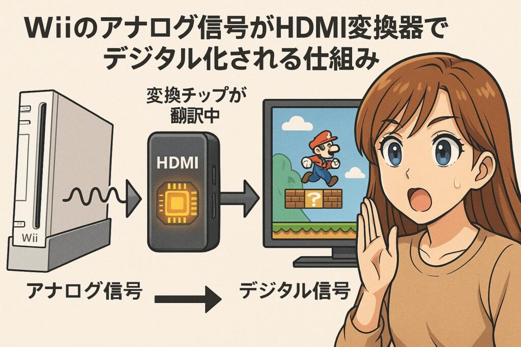 Wiiから出ている映像信号は「アナログ信号」です。一方で、現在のテレビにあるHDMI端子が受け取れるのは「デジタル信号」だけです。