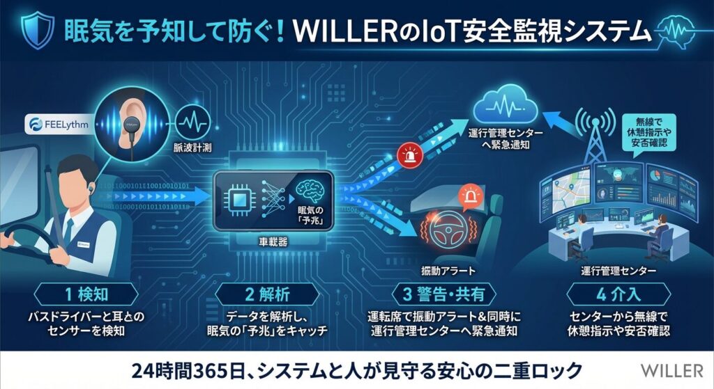 「運転手が居眠りしたらどうするの?」という質問に対し、WILLERは「人間任せにしない」ハイテクな回答を用意しています。