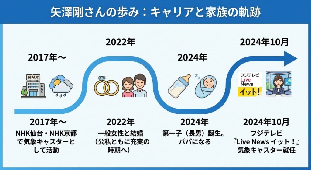 「テレビで家族の話をしていたような気がするけれど、実際はどうなの?」という、佐藤美咲さんのような視聴者の皆様のふとした疑問を解消するために、まずは矢澤剛さんの公式なライフイベントを整理してみましょう。
