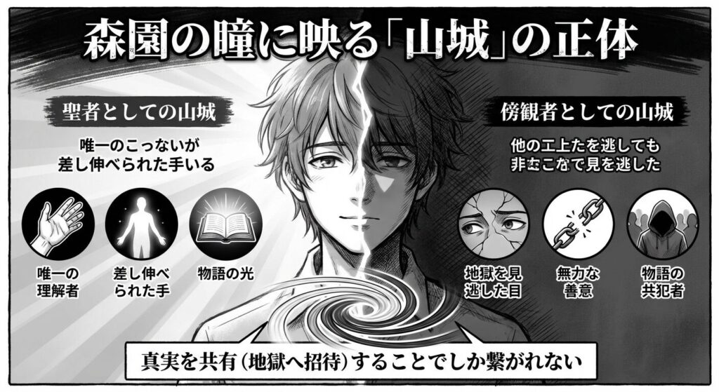 多くの読者が疑問に感じるのは、「なぜ森園は、自分を気にかけていたはずの山城先生まで地獄に引き込んだのか?」という点でしょう。山城と森園の関係は、森園にとっての「唯一の希望(聖者)」でありながら、同時に「自分を救い出せなかった傍観者」という、極めて複雑な二面性を持った関係にあります。